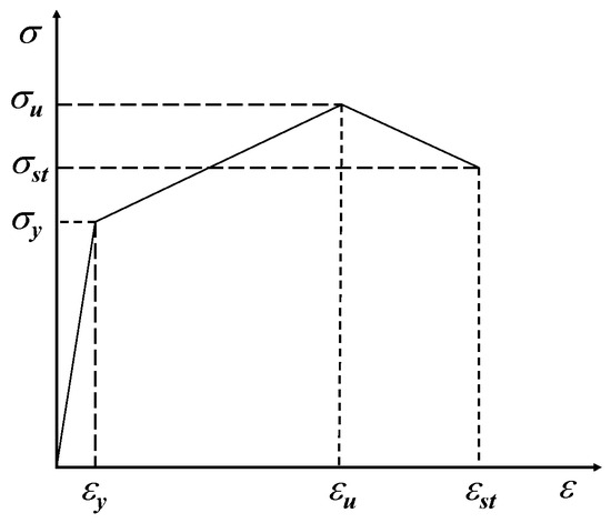 The following assumptions are made regarding the properties of steel materials: (1) the steel material is homogeneous and isotropic; (2) initial defects in the steel are not considered; and (3) the yield criterion adopts the von Mises criterion. To accurately simulate the stress situation of steel under low-cycle reversed loading and large deformations [29] while taking into account the influence of the Bauschinger effect on steel properties, a multilinear mixed strengthening criterion and a tri-linear model with a descending segment were adopted, as shown in Figure 3.