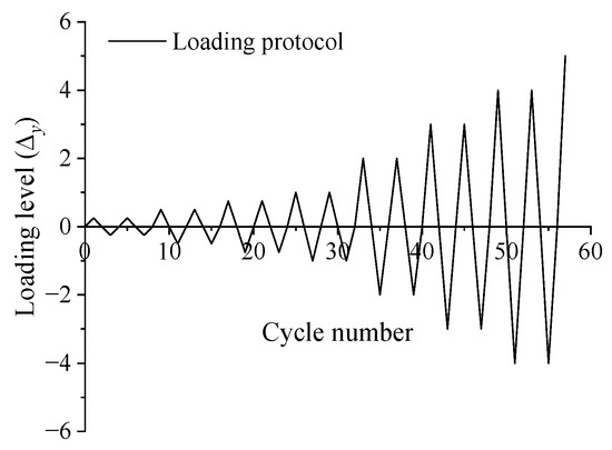 The FE loading protocol adheres to the complete loading system specified in the standard [30]: 0.25 , 0.5 , 0.75 , 1 , 2 , 3 , 4 , 5 …, where represents the yield displacement of the sample. Each loading increment is cycled twice, as shown in Figure 5.