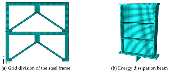 According to the calculation results, the grid size was adjusted as follows: the element size for the frame beams and frame columns was set to 60 mm, whereas the element size for the eccentric bracing members was 30 mm. To analyse the stress–strain conditions of the energy-dissipating beam section precisely, the grid in these areas was refined, with each plate component having an element size of 20 mm, as shown in Figure 6.