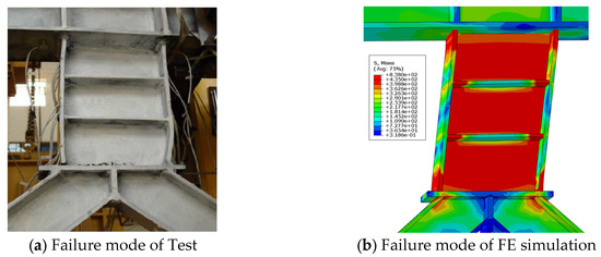 Figure 7 shows the failure modes of specimen Y-1 from both the experimental and FE analysis results. It is evident that the specimen experienced tearing and failure of the weld seam at the connection between the web plate and end plate of the energy dissipation beam section, as well as at the connection between the energy dissipation beam section and the flanges. The FE simulation results show that the failure locations are consistent with the experimental results and indicate that the stress values at these locations are significantly higher than the ultimate stress of the steel.