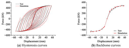 The hysteresis and skeleton curves of specimen Y-1 from both the FE analysis and experimental tests are presented in Figure 8. The hysteresis curves of the two results are symmetrical and full, with a shape similar to a shuttle, and the enveloping areas of the hysteresis loops at each loading stage are roughly equal. The detailed parameters are shown in Table 3. Compared with the experimental results, the buckling load in the FE analysis results decreased by 4.89% (increased by 0.53% in the negative direction), and the ultimate load decreased by 3.96% (increased by 2.35% in the negative direction). The reasons for this error may include the following two points: (1) The FE simulation is more idealized than the experimental simulation is, without considering defects such as steel properties and weld stress, and the constraint conditions for complete rigidity at the bottom of the column cannot be guaranteed during the experiment, resulting in slightly greater initial stiffness in the FE simulation than in the experiment; (2) the material constitutive relationship in the finite element simulation is a tri-linear model, but during the experimental loading, as the steel enters the plastic development stage, its stress–strain relationship is not linear.