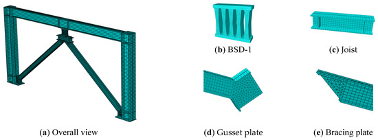 In this model, the frame beams, frame columns, and stiffeners of the joist are fabricated from Q355 steel, whereas all other components are made from Q235 steel. The steel has an elastic modulus of 206,000 MPa and a Poisson’s ratio of 0.3; additional properties are presented in Table 2.