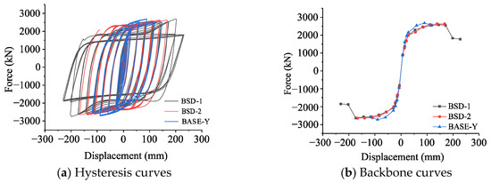 - Compared with those of BASE-Y, the ductility coefficients of BSD-1 and BSD-2 were increased by 59.57% and 39.47%, respectively, whereas the corresponding bearing capacities were reduced by 3.26% () and 2.78% (), respectively. This finding indicates that the equipment of BSD devices in YEBFs can significantly enhance structural ductility with only a minor sacrifice in bearing capacity.