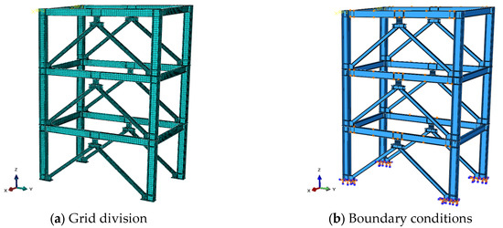 Both frames were subjected to fully fixed boundary conditions at the base of the columns, whereas lateral constraints in the X-direction were applied to both sides of the main beam. Coupling points were established in the Y-direction at the node domain on one side of the 3-story frame, where cyclic horizontal loads were applied. The loading method and grid division were consistent with those described in Section 3. Here, we chose only the grid division, and the boundary condition diagram of the BSDF is provided as an example, as shown in Figure 13.
