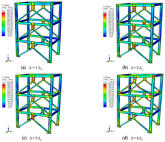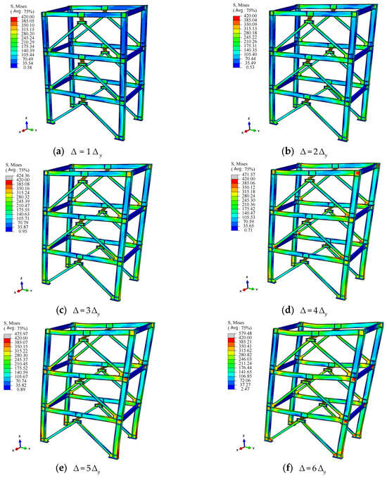 Figure 14 shows the stress cloud of the BSDF during cyclic loading. When the loading displacement reaches 1 , the stress is predominantly concentrated in the steel strips of the BSD, whereas the stress levels in the frame beams, frame columns, and bracing are relatively low. When the load continues to 4 , there is a significant increase in stress at the column bases, node domain, and flanges at the ends of the beams in the Y-axis direction, approaching the ultimate strength of the steel material. Notably, the stress increase is most pronounced near the column bases of the Y-axis frame beams on the 2nd story and 3rd story. This is attributed to the fact that during the loading process, the gusset plates are welded to the frame columns and beams, leading to a substantial increase in the flexural stiffness of the frame beams at these locations, causing the plastic hinge that should have appeared at the node position to move towards the midspan of the beam. The stress on the flange of the beam rapidly increases. When loaded to 5 , the stress values at the energy-dissipating steel strips are reduced. In contrast, the stress at the outer flanges at the lower ends of the first-story columns significantly increases. After the loading displacement reaches 6 , the stress at the column bases further increases and extends continuously along the bracing members. Pronounced plastic hinges appear near the node domains of the Y-axis direction frame beams at each story, and the stress begins to develop from the flanges towards the webs.