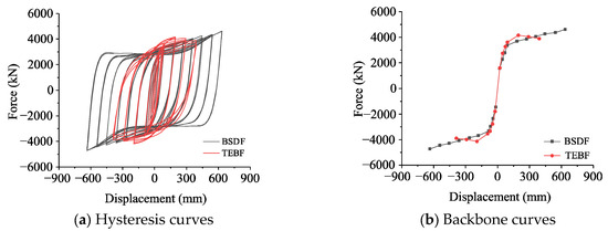 Figure 16 shows the force-displacement curves for frames BSDF and TEBF. The hysteresis curve of TEBF approximates a shuttle shape, whereas the hysteresis curve of BSDF resembles a Z-shape. Figure 16a shows that during the initial loading stage, owing to the shear-type energy dissipation beam of the TEBF, it has a high bearing capacity under small deformations, resulting in a larger hysteresis loop envelope area than the frame BSDF. When the loading displacement reaches 150 mm, the hysteresis loop envelope area of the BSDF gradually increases, whereas the TEBF exits operation due to buckling of the energy dissipating beam, so its hysteresis curve envelope area slowly decreases. Figure 16b shows that before attaining the yield displacement, both the energy-dissipating beam and the BSD devices are in the elastic working stage, with their backbone curves essentially being consistent. When the loading displacement reaches 150 mm, the slope of the TEBF backbone curve becomes negative because the web plate of the energy-dissipating beam begins to enter the buckling stage, resulting in a rapid decrease in bearing capacity; conversely, the slope of the BSDF backbone curve consistently increases throughout the loading process, indicative of a stable bearing capability.