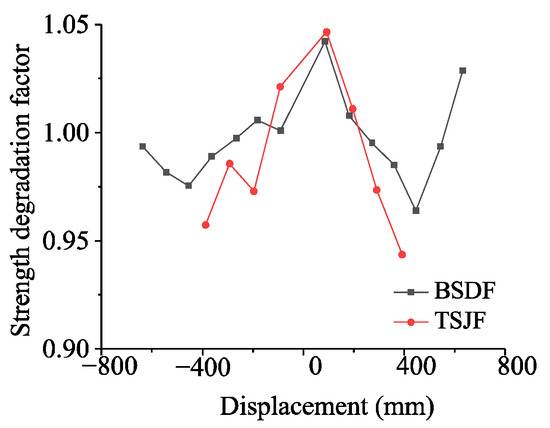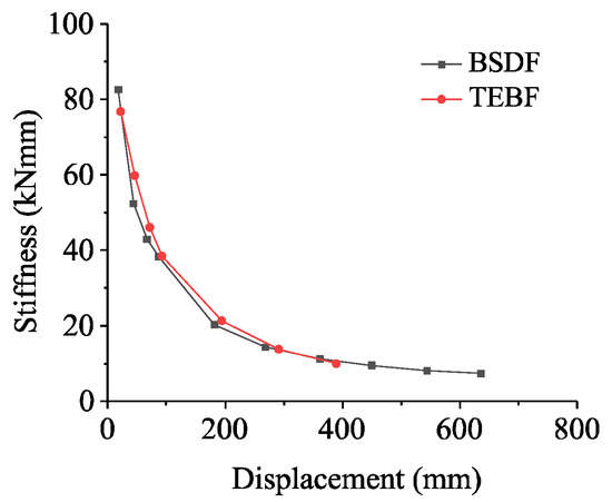 Figure 17 and Figure 18 illustrate the stiffness degradation and strength degradation curves for BSDF and TEBF, respectively. Both frame types exhibit similar stiffness degradation trends; however, the BSDF frame has an initial stiffness of 7.68% greater than that of the TEBF frame, although the stiffness degradation rate for the BSDF frame is slightly greater than that of TEBF. When the loading displacement is less than 150 mm, the strength of the BSDF frame tends to increase. In contrast, strength degradation begins for the BSDF frame when the loading displacement exceeds 150 mm, whereas the TEBF frame starts to experience strength degradation at a loading displacement of 100 mm.