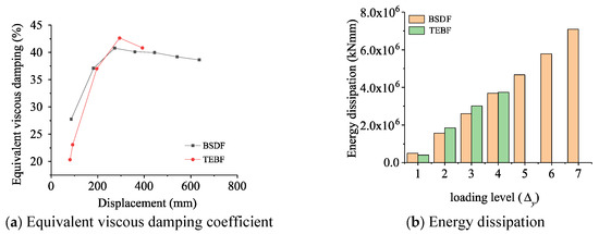 Figure 19 provides a comparison of the energy dissipation capacities of the BSDF and TEBF. The comparison is specifically conducted by evaluating the equivalent viscous damping coefficients and energy dissipation at various loading displacements. As illustrated in Figure 19a, under cyclic loading, the equivalent viscous damping coefficients for both frame types initially increase and then decrease, with the inflection point occurring at a displacement of approximately 300 mm. Figure 19b clearly shows that the TEBF results in higher energy dissipation values than the BSDF frame does when the loading displacement is less than 4 . However, with further increases in loading displacement, buckling initiates in the web of the energy dissipation beam section of the TEBF, whereas the BSDF demonstrates a sustained capacity for energy dissipation.