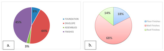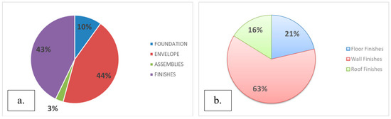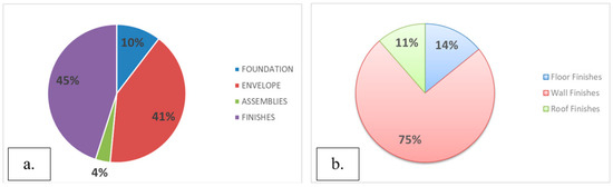 Figure 4a shows that the total IEE for P2 was 2008 GJ. This comprised 161 GJ for the foundation (8%), 875 GJ for the envelope (44%), 58 GJ for the assemblies (3%), and 914 GJ for the finishes (45%). It is also worth noting that the area covered by the wall finish was 914 m2, whereas the area of P2 was 266 m2. As shown in Figure 4b, the finishes used for P2 were the largest contributors to the IEE; the floor finish was 160 GJ (18%), the wall finish was 623 GJ (68%), and the roof finish was 132 GJ (14%). This indicates that the embodied energy of the wall finishes for P2 was more significant than that of the combined floor and roof finishes.