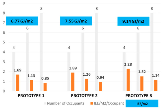 The figure shows the IEE/m2 values for each of the prototypes as a function of the number of occupants. For Prototype 1 (6.77 GJ/m2), the figure shows that when the number of occupants is four, IEE/m2/occupants is 1.69 GJ/m2, when it is six occupants, it is 1.13 GJ/m2, and when it is eight occupants, it is 0.85 GJ/m2. Similarly, for Prototype 2 (7.55 GJ/m2), the figure shows that when the number of occupants is four, IEE/m2/occupants is 1.89 GJ/m2, when it is six occupants it is 1.26 GJ/m2, and when it is eight occupants it is 0.94 GJ/m2. Finally, for Prototype 3 (9.14 GJ/m2), the figure shows that when the number of occupants is four, IEE/m2/occupants is 2.28 GJ/m2; when it is six occupants, it is 1.52 GJ/m2, and when it is eight occupants, it is 1.14 GJ/m2.