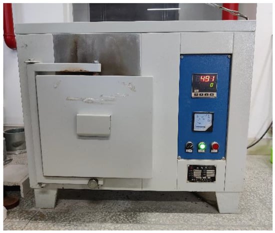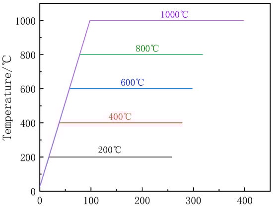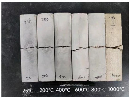 The experiment was divided into six groups based on varying calcination temperatures, specifically ambient temperature, 200 °C, 400 °C, 600 °C, 800 °C, and 1000 °C. The calcination was conducted using a box-type resistance furnace for heating, as illustrated in Figure 1, with a heating rate of 10 °C/min [,,]. Upon reaching the predetermined temperature, the furnace was held at a constant temperature for 4 h. Figure 2 depicts the method of heating the specimens. Subsequently, the high-temperature furnace was turned off, allowing the specimens to cool naturally within the furnace. Once the specimens had cooled to ambient temperature, the furnace was opened, and the specimens were extracted for measurement and analysis of their various properties. Figure 3 shows the surface of PP mortar samples after different high temperatures.
