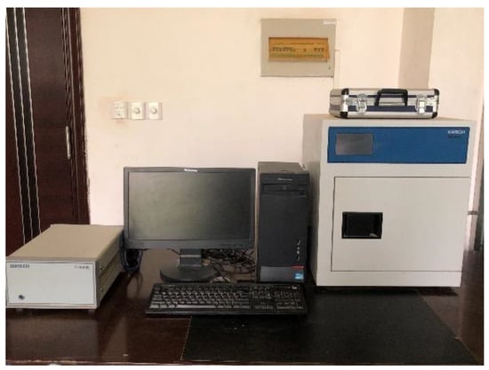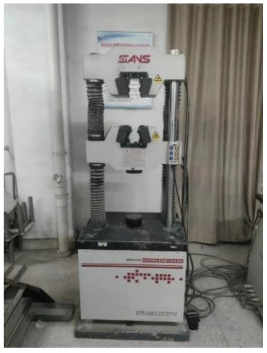 The thermal conductivity experiment utilized the transient line heat method by employing the TC3000E thermal conductivity meter that was independently developed by Xi’an Xiaxi Electronics Technology Co., Ltd. (Xi’an, China), as shown in Figure 4. The testing of the mortar samples’ thermal conductivity was conducted in accordance with the operation standards stipulated in “Measurement of Thermal Conductivity and Thermal Diffusivity of Building Materials: Transient Plane Heat Source Method” (GB/T32064-2015) []. Utilizing the SHT4305 Universal Testing Machine, compressive and flexural strength tests were performed on the mortar specimens following the guidelines delineated in “Cement Mortar Strength Test Methods (ISO Method)” (GB/T17671-2021) []. The stress–strain relationship of cement mortar is derived from cylindrical specimen loading, conducted at a rate of 0.1 mm/min. Data from load and displacement sensors are automatically collected and subsequently processed to yield the stress–strain curve. Figure 5 shows the universal testing machine.