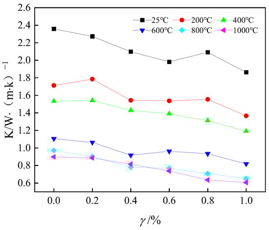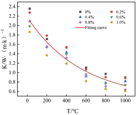 Figure 6 illustrates the effect of fiber content on the thermal conductivity of the PP fiber mortar. It is evident that the inclusion of fibers and elevated temperatures both influence the thermal conductivity of the mortar, with the latter being the primary factor. Following exposure to the same high temperature, the thermal conductivity of the mortar gradually diminishes with the increase in fiber content. When the fiber content is at 1% compared to non-fiber-reinforced mortar, the thermal conductivity reductions at various temperatures are 22%, 20%, 22%, 26%, 33%, and 33%. This indicates that rising temperatures enhance the ability of the fibers to decrease the mortar’s thermal conductivity. This is primarily due to the inherently low thermal conductivity of PP fibers; their inclusion inevitably leads to a decline in the mortar’s thermal performance []. After exposure to high temperatures, the PP fibers melt, leaving numerous pores and cracks within the mortar. These pores and cracks impede heat transfer, thus reducing the thermal conductivity. Figure 7 depicts the relationship between the thermal conductivity of PP fiber mortar and temperature. It distinctly demonstrates that the effect of a high temperature on thermal conductivity gradually levels off as the temperature increases, with reductions of 25%, 11%, 30%, 17%, and 4% for each subsequent temperature change. The thermal conductivity decreases significantly between 25 and 200 °C, as the evaporation of free water creates internal stress fractures that disrupt the mortar’s integrity, producing numerous cracks and holes. From 200 to 400 °C, the decrease slows down as the loss of absorbed water and interlayer water forms new pores without adding excessive cracks. Therefore, between 200 and 400 °C, the thermal conductivity decreases but at a reduced rate. From 400 to 600 °C, the thermal performance sharply declines as the dehydration decomposition of calcium hydroxide causes further deterioration in the mortar’s internal structure, forming an abundance of fine pores and cracks, leading to a substantial reduction in the mortar’s thermal conductivity [].