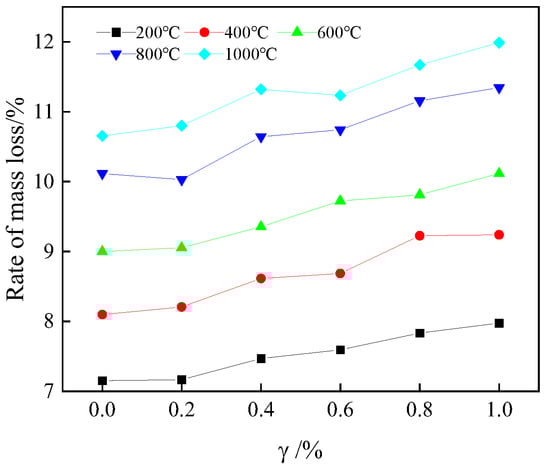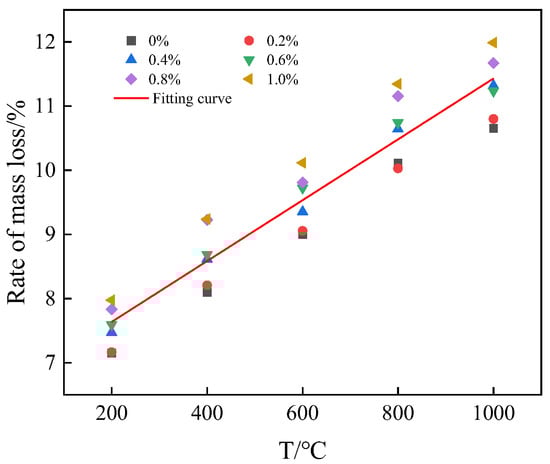 Figure 8 presents the curve of the mass loss rates for the PP fiber mortar following exposure to five different elevated temperatures. It reveals that the mass loss rates of the mortar samples with various fiber contents escalate linearly with increasing temperatures. After being exposed to 200 °C, the mass loss rates for all PP fiber contents range between 7.2% and 8.0%, attributed mainly to the evaporation of free water within the mortar. Following 400 °C exposure, the mass loss rates lie between 8.1% and 9.2%. At this temperature, in addition to free water, the physically adsorbed water and interlayer water als evaporate. Following 600 °C, the mass loss rates range from 9.0% to 10.1%, principally due to the decomposition of calcium hydroxide and dehydration of cementitious substances, thereby augmenting the mass loss. During the 800 °C–1000 °C stages, the mass loss rates are between 10.1–11.3% and 10.7–12.0%; the continual decomposition of C-S-H and calcium carbonate under the influence of high temperatures leads to an ongoing increase in mass loss. Furthermore, as can be discerned from Figure 9, after similar high-temperature exposure, the mass loss of the PP fiber mortar is slightly greater compared to the non-fiber-reinforced mortar, and this increment gradually increases. This phenomenon is caused by the polypropylene fibers’ melting point of 167 °C; once the temperature within the mortar exceeds this threshold, the fibers melt, and some of the melted fibers escape with water vapor, resulting in the formation and gradual connection of pores and fine cracks. The higher the fiber content is, the more melting and loss occurs, further amplifying the internal defects. Consequently, the mortar’s mass loss rate grows incrementally with increased fiber contents []. Nevertheless, when the PP fiber content is 0.2%, the mass loss rate due to high temperatures is relatively minimal compared to other fiber contents, and almost no mass loss occurs in comparison to in the non-fibered mortar.