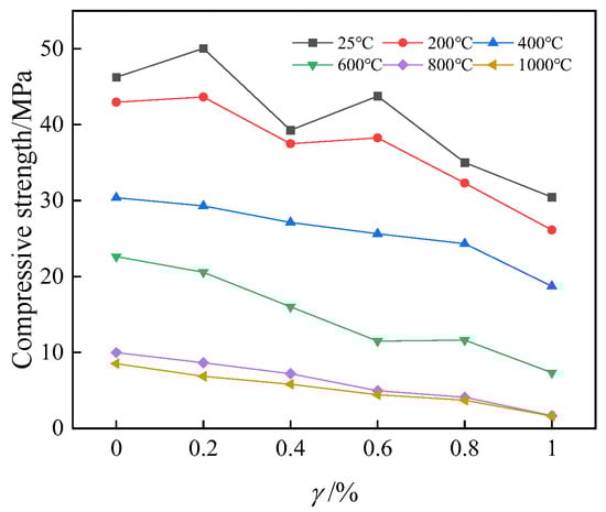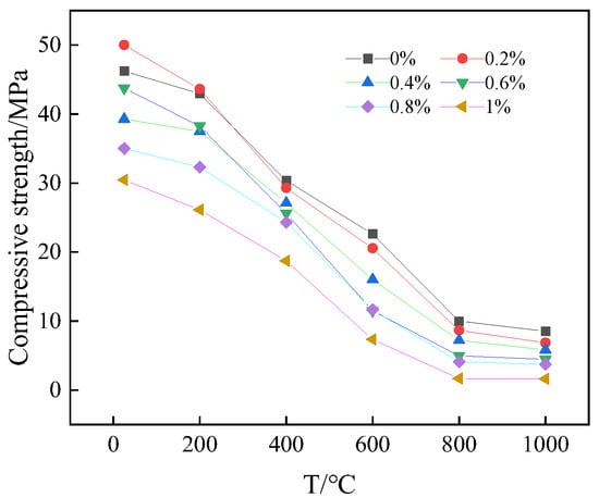 Figure 10 delineates the variation in the compressive strengths of specimens with differing fiber contents under elevated temperatures. As the temperatures increase, the compressive strengths of the specimens across all fiber concentrations consistently diminish. Between 200 °C and 800 °C, this decline in strength generally adheres to a linear trend. The specimens that were subjected to 200 °C exhibit a reduction in strength, albeit with a modest magnitude when contrasted to the decline between 200 °C and 800 °C. Conversely, between 800 °C and 1000 °C, the compressive strength remains essentially static. Exploring the causation, the elevated temperature at 200 °C triggers the vaporization of moisture, prompting unreacted cement within the mortar to undergo secondary hydration and leading to an increased formation of C-H-S. This compensates for the strength losses induced by the emergence of substantial pores and minor cracks due to the evaporation of free water. As the temperature oscillates between 200 °C and 800 °C, internal materials in the mortar dehydrate and decompose under the thermal influence, culminating in the generation of significant voids, thus markedly reducing the strength. However, during the 800 °C to 1000 °C phase, the cementitious substances within the mortar are largely dissipated by 800 °C, resulting in negligible strength variations between 800 °C and 1000 °C []. The compressive strength of the PP fiber mortar when subjected to high temperatures (200 °C, 400 °C, 600 °C, 800 °C, and 1000 °C) exhibits a gradient decrease, which can primarily be attributed to the evaporation of free water in the cement at 200 °C, leading to a reduction in strength. Between 400 °C and 800 °C, the cement matrix within the mortar undergoes both expansion and contraction, resulting in the formation of microcracks and macroscopic cracks. These induced cracks further degrade the compressive strength of the mortar. Additionally, as the temperature increases, the mineral components of the cement may undergo partial phase transformations, including the structural degradation of C-S-H (calcium silicate hydrate) gel, which further weakens the material. This progressive deterioration of the cement matrix leads to a continuous, gradient-like decline in compressive strength.