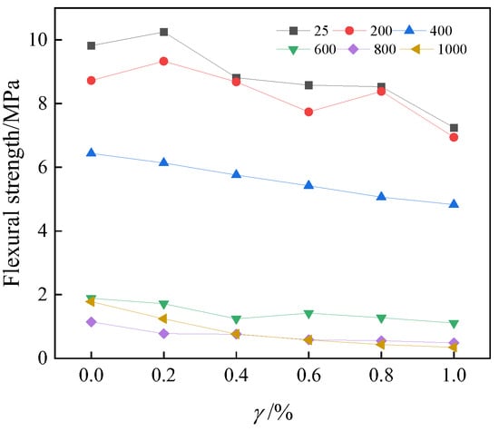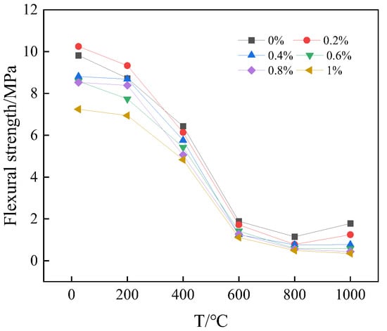 Figure 12 illustrates the impact of temperature on the flexural strength of the PP fiber mortar. As depicted, the flexural strength of the mortar with varying PP fiber contents manifests as a declining trend, with the specimen strength diminishing progressively with the rising temperature. Within the ambient to 200 °C range, the decrease in flexural strength is gradual, with a reduction ranging from 1.47% to 11.15% following exposure to 200 °C, relative to ambient temperature specimens. Beyond 200 °C, the deleterious effect of an elevated temperature on the PP fiber mortar’s flexural strength intensifies, leading to a precipitous decline in flexural strength from 200 °C to 600 °C, with reductions ranging from 33.3% to 40.6% at 400 °C and from 80.7% to 85.8% at 600 °C. Above 600 °C, the decline in strength decelerates, with both the 800 °C and 1000 °C specimens displaying strength losses between 81% and 95% compared to the ambient-temperature specimens, a slight decline at 800 °C relative to 600 °C, and virtually no change in strength from 800 °C to 1000 °C. Figure 13 portrays the curve of the flexural strength in relation to the fiber content, revealing that at an ambient temperature and 200 °C, the mortar’s strength peaks with a PP fiber content of 0.2%. Hence, within the ambient to 200 °C temperature range, the optimal inclusion rate of PP fiber in mortar is 0.2%. When the content exceeds 0.2%, the mortar’s strength declines in correlation with the increase in fiber content, exhibiting a linear decrease in strength with the augmentation of PP fiber from 400 °C to 1000 °C. At 200 °C, the channels that are formed by the melting of polypropylene (PP) fibers facilitate the complete evaporation of moisture within the cement matrix, without compromising the structural integrity of the cementitious material. However, when the temperature exceeds 200 °C, the cement matrix begins to degrade, leading to the gradual development of internal cracks. These microcracks and macrocracks within the mortar are more susceptible to propagation under bending stresses, with cracks rapidly advancing due to localized stress concentrations, resulting in a significant reduction in flexural strength. Consequently, between 200 °C and 600 °C, the flexural strength of the mortar decreases substantially. At 600 °C, large through-cracks have already formed within the mortar, leading to failure under bending loads. As a result, the variation in flexural strength beyond 600 °C becomes minimal.