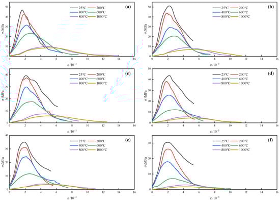 Stress–strain curve of PP mortar after high temperatures: (a) ; (b) ; (c) ; (d) ; (e) ; (f) .