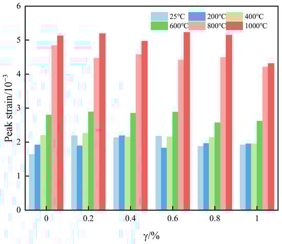 Figure 14 delineates the relationship between the stress–strain curve of the PP fiber mortar after exposure to elevated temperatures. It can be discerned that below 200 °C, the stress–strain curve of the mortar without added fiber reaches peak stress and descends swiftly, culminating in brittle failure. Conversely, in the 400 °C to 1000 °C range, the mortar’s stress–strain curve—whether in its ascending or descending segments—becomes markedly gradual. Overall, as the temperature increases, the slope of the stress–strain curve of the PP fiber mortar progressively decreases, with the peak point shifting to the right and becoming more gradual. Additionally, the downward trajectory of the curve exhibits a continuous reduction in its steepness. At a constant temperature, the stress–strain curves of mortars with varying PP fiber contents display distinct variations. With an increase in fiber content, the slope of the stress–strain curve progressively decreases, and the curve becomes smoother at the peak point. During the post-peak descending phase, the curve for the mortar without PP fibers exhibits a sharp reduction in stress, whereas the stress–strain curves of the fiber-reinforced mortars show a gradual attenuation in the rate of decline, with the decrease becoming less pronounced as the fiber content increases.