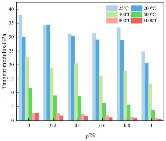 With the increase in temperature, the forms of the stress–strain curves of each mortar group progressively flatten; the peak points of the curves shift rightwards and downwards; and the stiffness rapidly degenerates. The peak strain of the mortar variably enlarges, with the cement mortar exposed to 1000 °C exhibiting a 1.2–2.1-fold increment in peak strain compared to the fiber cement mortar at an ambient temperature. The peak strain of the PP fiber mortar exhibits a gradual decrease as the temperature increases. Under high-temperature conditions, the tangent modulus of the mortar gradually diminishes, with the cement mortar demonstrating a decline of approximately 90% in tangent modulus compared to the fiber cement mortar at an ambient temperature after exposure to 1000 °C. This occurs as the internal binding substances within the fiber mortar are altered and the PP fibers melt, resulting in a gradual increase in the mortar’s porosity and a corresponding reduction in density []. This is primarily characterized by an increase in internal porosity and a decrease in density as the temperature increases. The material’s structure progressively becomes more porous, resulting in a reduction in stiffness and a decline in the tangent modulus. The mortar’s tangent modulus is generally influenced by the specimen’s porosity and density. In general, the tangent modulus of PP-fiber-reinforced mortar decreases progressively as the temperature increases. Figure 15 and Figure 16 depict the influence of temperature on the peak strain and tangent modulus of the PP fiber mortar.