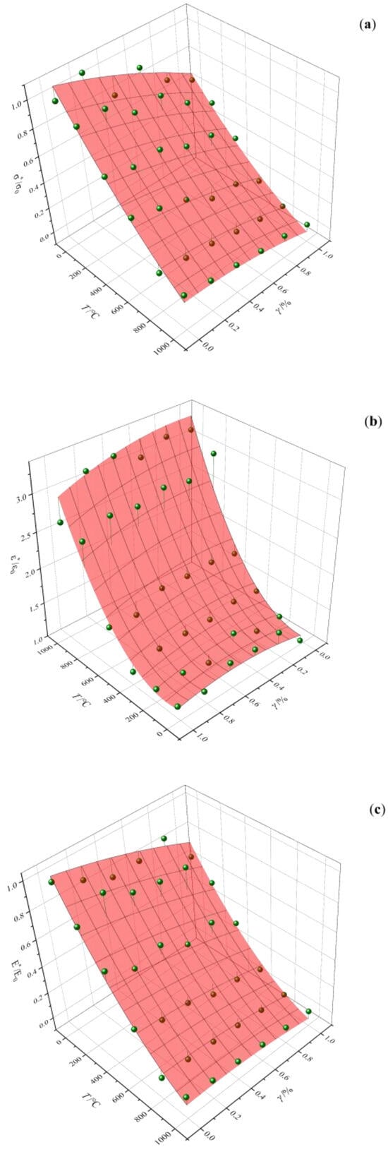 By analyzing the data obtained from the experiment, the relationships between various temperatures and fiber contents with respect to the mortar’s peak stress, peak strain, and tangent modulus can be delineated, as illustrated in Figure 17. The fitted surface in the figure aligns well with the experimental values. As the temperature rises, both the ratio of the mortar’s peak stress and the ratio of the elastic modulus gradually decrease, demonstrating a linear trend of reduction; conversely, the peak strain gradually increases with the temperature’s elevation. Between 25 and 400 °C, the ratio of E/E0 experiences a relatively gentle growth, whereas the rate of increase in the tangent modulus ratio accelerates when the temperature exceeds 400 °C. In contrast to the temperature, the influence of the fiber content on the mortar is more negligible. An increase in fiber content will gradually diminish the ratio of the peak stress and tangent modulus of the mortar at different temperatures, but its impact on the proportion of the peak strain is minimal.