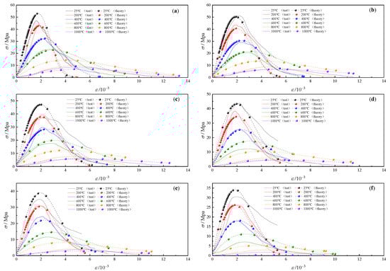 By substituting Equation (13) into Equation (12), one can derive the mortar’s statistical damage-constitutive model, considering the effects of both temperature and fiber. This enables the determination of the complete stress–strain curve for the mortar under arbitrary high temperatures and fiber actions, based on the stress–strain curve that was obtained at room temperature without fiber inclusion. Figure 11 contrasts the results of the full uniaxial compression curve of the mortar following various high-temperature treatments with different fiber contents, as calculated by the model, with the predicted full curve. It can be discerned from Figure 18 that the stress–strain curves that were derived from the constitutive model are in commendable alignment with the experimental curves, and they aptly predict the trends in the stress–strain relationship changes under different high temperatures and varying fiber contents.