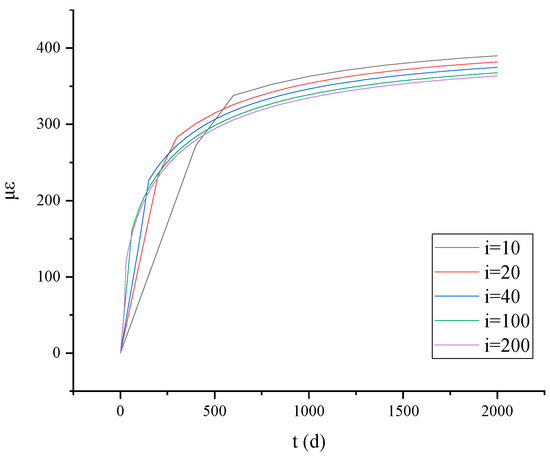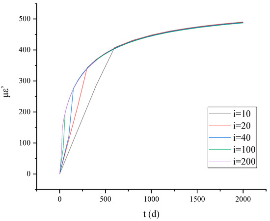 There is an integral term in Equation (10). As the stress of concrete changes with time during creep, Equation (10) cannot be directly integrated. The numerical method divides the time period into small time periods with an interval of . The discrete time point is . The calculation method of discrete integral term is as follows: