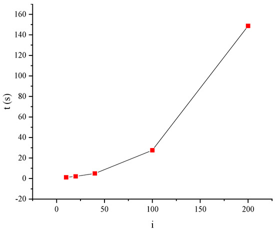 The red square in Figure 7 is the calculate time in different “i”. It can be seen from Figure 7 that with the increase in , the time required for numerical calculation is growing faster and faster, which is very unfavorable for large calculations. The calculation results of different using the trapezoid method are shown in Figure 8 and Figure 9.