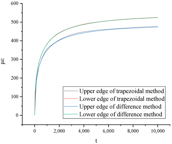 When the numerical method or trapezoidal method is used, the information from the intermediate calculation process of each time step needs to be stored. There are some disadvantages in the creep analysis of large and complex structures, so some scholars have studied the creep calculation method based on a viscoelastic model. When using the viscoelastic model calculation method, there is no need to store the intermediate calculation information of each time step, which saves a certain amount of calculation [21]. However, the parameters of a viscoelastic model cannot be determined according to the composition and mechanical properties of materials. Generally, the parameters in the model are fitted according to the known creep function. The fitted model parameters often have certain limitations in application. For example, if the initial loading time is short, the creep calculation results based on the viscoelastic model are not ideal [21,22]. Therefore, the difference method for creep calculation is proposed in this study. The partial derivative of Equation (10) gives the following: