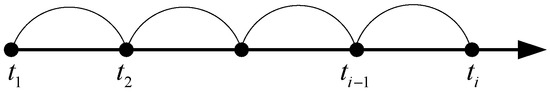 The creep of concrete is calculated after integration into Equation (22). According to the rapid growth in the early stage and slow growth in the late stage of creep, the function trend of is rapid decline in the early stage and slow decline in the late stage. is divided into i time periods, and each time point is . The integral area is divided into the form of adding multiple trapezoidal areas, as shown in Figure 2.