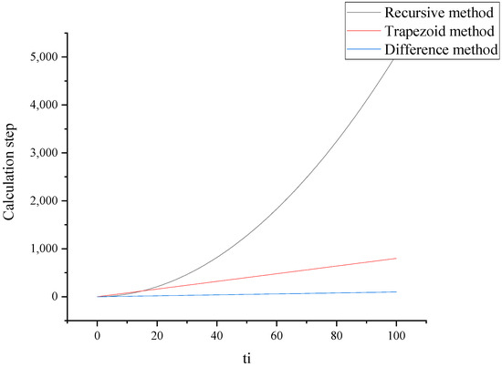 It can be seen from Equations (47)–(49) that the calculation steps required by the numerical method show a quadratic increasing law with the increase in . The calculation steps required by the trapezoidal method and difference method increase linearly with the increase in , as shown in Figure 13.