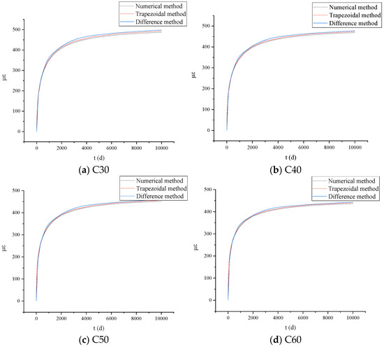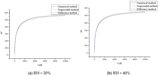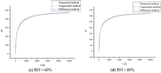 In order to further verify the accuracy of the method in this study, the initial conditions of the previous example are changed. Compare the difference in calculation results under different concrete grades and environmental humidities, as shown in Figure 14, Figure 15, Figure 16 and Figure 17.