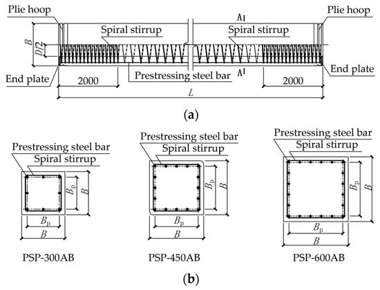 In order to study the bending bearing performance of concrete precast square piles with snap-welded joints, solid square piles with three cross-section sizes of 300 mm, 450 mm, and 600 mm were selected. According to steel rods for prestressed concrete (GB/T5223.3-2005) [24], the prestressed steel reinforcement tensile control stress is 0.7 times the standard tensile strength value of 1420 MPa, which equals 994 MPa. Pile type numbers are PSP-300AB, PSP-450AB, and PSP-600AB, where “PSP” indicates prestressed concrete solid square pile, the number indicates the pile’s side length, and “AB” indicates the level of effective prestressed applied to the pile. In order to facilitate the identification of pile body test pieces and joint test pieces, the letter ZS is added before the pile type number to indicate pile body test pieces. Add the letter LK for the screw joint specimen and add the letter LKHJ for the screw-welded joint specimen. The corresponding geometric dimensions and structural reinforcement of pile type are shown in Figure 1 and Table 1. B is the section side length of hollow square pile, and Bp is the distribution side length of prestressed reinforcement. To ensure the connection strength and reliability between the pile end plate and the pile body, a connection method involving drilling holes in the end plate and then sealing welding is used to add hot-rolled ribbed thread steel bars at the joint end plate. For the PSP-300AB pile, 8C14 threaded steel bars were used with an anchorage length of 500 mm. For the PSP-450AB pile, 8C16 threaded steel bars were used with an anchorage length of 600 mm. For the PSP-600AB pile, 12C18 threaded steel bars were used with an anchorage length of 650 mm.
