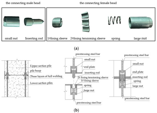 The screw clamping and welding joint achieves mechanical connection through a screw clamping connector, while E4303 type welding rod is used for circumferential welding around the pile. The screw clamping and welding joint includes the connecting male head and the connecting female head, as shown in Figure 2. The connecting male head is composed of a small nut and an inserting rod. The small nut is stuck to the steel bar pier head and connects to the prestressed main bar. The inserting rod is connected to the small nut through the end thread. The connecting female head is composed of a large nut, a #1 fixing sleeve, a #2 fixing tensioning sleeve, and a spring, a #1 fixing sleeve is connected with a large nut through an external thread, and a #2 fixing tensioning sleeve is composed of 3 arc-shaped bodies with internal tapping threads. The card is located in the #1 fixing sleeve, and the spring is set under the #1 fixing sleeve to buffer and tighten the effect. When connecting the male head to the female head, insert the #1 fixing sleeve through the insert rod, and the #2 fixing tension sleeve corresponding clamping, to achieve close connection.