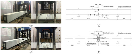 Loading device and measuring point arrangement for flexural tests: (a) physical diagram of loading device of pile body specimen under bending test, as ZS-PSP-450AB specimen; (b) schematic diagram of loading and measuring point arrangement of pile body specimen under bending test, as ZS-PSP-450AB specimen; (c) physical drawing of loading device for bending test of joint specimen, as LKHJ-PSP-600AB specimen; (d) schematic diagram of loading and measuring point arrangement of joint specimen under flexural test, as LKHJ-PSP-600AB specimen.