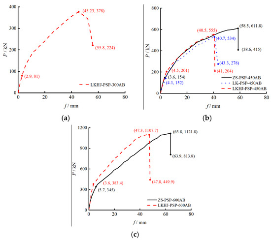 The failure morphology of the bending specimen is shown in Figure 5. The bending failure mode of the LKHJ-PSP-300AB specimen is that the concrete in the upper part of the pure bending section is crushed, the bending failure mode of the ZS-PSP450AB specimen is shear failure in the right-bending shear section, the surface concrete falls off and the hoop is pulled off, and the bending failure mode of the LK-PSP-450AB specimen is that the steel bar pier on the right side of the joint end plate is pulled off. The bending failure mode of the LKHJ-PSP-450AB specimen is that the steel rod is broken in the tension zone at the bottom of the pile body in the left-bending shear section, the bending failure mode of the ZS-PSP-600AB specimen is that the concrete is crushed in the pressure zone at the upper part of the pure bending section, and the bending failure mode of the LKHJ-PSP-600AB specimen is that the steel rod pier head on the left side of the joint end plate is pulled off. When the four joint specimens were finally destroyed, the joints were intact and the direct gaps between the end plate and the concrete of the pile body were small, which indicates that the installation of anchorage reinforcement can adequately strengthen the integrity of the specimens and effectively ensure the flexural bearing performance of the pile body connection.