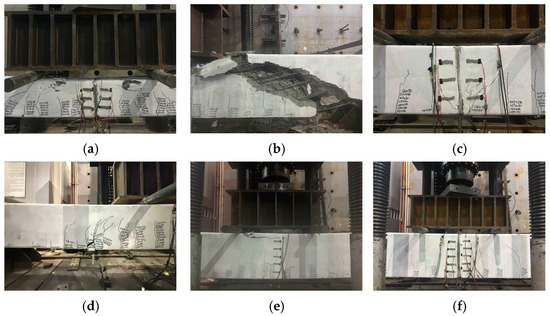 Failure form of specimens for flexural tests: (a) LKHJ-PSP-300AB; (b) ZS-PSP-450AB; (c) LK-PSP-450AB; (d) LKHJ-PSP-450AB; (e) ZS-PSP-600AB; (f) LKHJ-PSP-600AB.