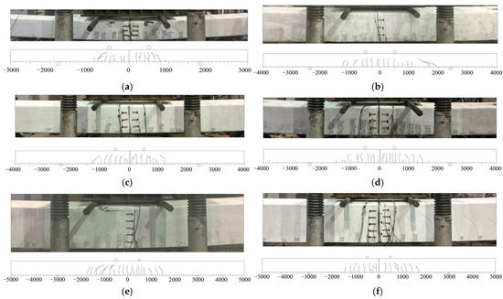Crack distribution of specimens for flexural tests: (a) LKHJ-PSP-300AB; (b) ZS-PSP-450AB; (c) LK-PSP-450AB; (d) LKHJ-PSP-450AB; (e) ZS-PSP-600AB; (f) LKHJ-PSP-600AB.