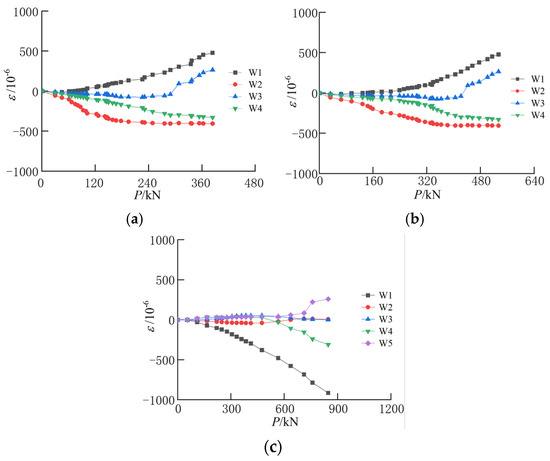 Development of weld strain of joint specimens for flexural tests: (a) LKHJ-PSP-300AB; (b) LKHJ-PSP-450AB; (c) LKHJ-PSP-600AB.