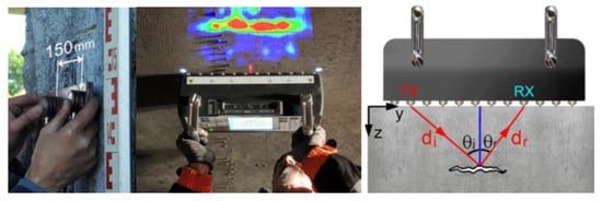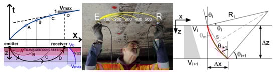 14], this methodology facilitates the mapping of damage levels, particularly at the deck intrados, by discerning variations in the UPV. Integrating UPV measurements with rebound hammer assessments enriches the detail and accuracy of surface damage evaluations, enabling a more nuanced understanding of the material’s condition. More advancements in ultrasonic testing techniques, such as pulse refraction and pulse-echo tomography, as introduced by Felicetti [