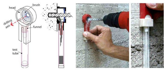Figure 8, developed and patented for this purpose, facilitates concrete powder collection and orderly storage during drilling. This system has been proven effective in maintaining the sequence of extracted samples, aiding in accurate depth assessment of fire-damaged concrete. The carbonation test is an efficient method for estimating the carbonation depth in concrete, which reflects the extent of damage from high temperatures. When concrete is heated to 450–500 °C, calcium hydroxide (portlandite) undergoes dehydroxylation, reducing the concrete’s pH. This change in pH can be used to determine the depth of exposure to these temperatures, a measure often termed the carbonation depth, Gerasimidis et al. [