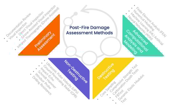 The assessment of post-fire damage in concrete structures involves a combination of visual inspections, NDT, and destructive testing techniques. Recent advancements, including machine learning algorithms and digital image processing have been used to automatically classify and quantify damage levels, significantly enhancing the efficiency and accuracy of fire damage assessments. These methods evaluate concrete and reinforcement’s physical and mechanical properties after exposure to high temperatures.