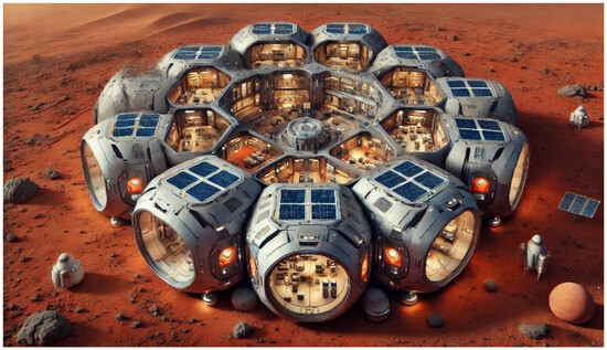 Martian buildings possess qualities such as safety, efficiency, expandability, temperature, gravity, protection against radiation, solar wind, cosmic rays, and solar flares. Safety is paramount in the design of Martian habitats. This requires incorporating multiple levels of redundancy into each system. For example, habitats should be divided into interconnected, pressurized compartments. In the event of an emergency, such as a fire or loss of pressure, each compartment should have at least two exit routes. The design should also ensure that the failure of one unit does not isolate other functional areas [6]. Efficiency is crucial given Mars’ distance from Earth and its limited resources. The design should minimize energy consumption and labor requirements while maximizing efficiency. This means using materials and systems that are effective and sustainable in the Martian environment [7]. The colony design should allow for easy expansion without compromising the integrity or quality of existing structures. A modular approach can facilitate this, allowing for the addition of additional units as needed [6]. Habitability is also perhaps the most challenging aspect to measure, but it is essential for the mental health of the residents. Factors such as natural light and views are very important; therefore, incorporating windows presents engineering challenges but is necessary to create comfortable living spaces. Attention to social dynamics and psychological needs will also play a vital role in ensuring the success of a colony [8,9]. However, engineering challenges include Mars’s average surface temperature is about −60 degrees Celsius, which is associated with significant temperature changes during the day and night. This requires tight insulation and temperature regulation systems to prevent structural stresses [1,10,11]. With only 38% of Earth’s gravity (roughly 3.7 m/s2), the main structural concern shifts from supporting buildings against gravity to ensuring they stay connected to the Earth. This requires innovative engineering solutions for wind loads and other forces [12,13]. Mars has a weak magnetic field and a thin atmosphere that exposes the inhabitants to different types of radiation [14]. Charged particles emitted by the Sun can be reduced by covering living spaces with about 1 m of Martian soil (regolith) [15]. Furthermore, Cosmic rays are more challenging but can be somewhat shielded using regolith [16]. Moreover, solar flare events are more difficult but predictable. Residents can prepare for these events by receiving adequate warnings before solar flares [17,18]. Despite Mars’s thin atmosphere, this planet has a dynamic climate. One important phenomenon is the seasonal dust storms that can cover the entire planet. These storms occur when winds lift very small dust particles from the Earth’s surface and carry them up to 100 km per hour. Finally, human habitation on Mars requires precise, safe, and efficient habitat design. Technologies such as BIM and blockchain make it possible to optimize construction processes and manage the specific challenges of living on this planet. These approaches help create sustainable infrastructure and make it possible to realize the dream of living on Mars.