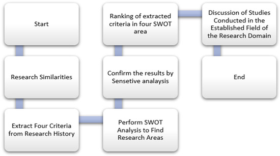 Figure 2 shows the flow chart of the research process. The flowchart begins with the “Start” stage, followed by the “Research Similarities” stage, which involves a thorough analysis of previous studies to provide context for the current research. The second stage, “Extract Four Criteria from Research History”, involves identifying and categorizing the important aspects of the SWOT framework: strengths, weaknesses, opportunities, and threats. The collected criteria are then ranked across the four SWOT domains using the Analytic Hierarchy Process (AHP) to assess their relevance. After ranking, the process moves on to “Perform SWOT Analysis to Find Research Areas”, where the data are reviewed to identify areas that require improvement or additional research. The penultimate stage is the “Discussion of Studies Conducted in the Established Domain of the Research Domain”, which evaluates the findings from the perspective of the existing body of knowledge. The flowchart closes with the “End” stage.