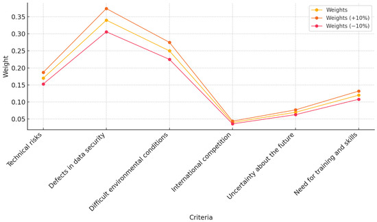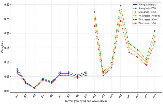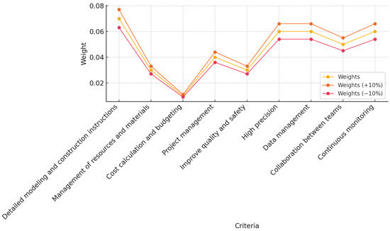 Strength sensitivity analysis table and chart: Sensitivity analysis of strengths (Table 8, Figure 3) shows how differences in criteria weights affect their relative importance. To ensure robustness of the analysis, the weight of each criterion was varied by ±10%. Criteria such as “accurate modeling and manufacturing instructions” (0.07), “high accuracy” (0.06) and “data management” (0.06) have moderate sensitivity, with adjusted weights ranging from 0.063 to 0.077 and 0.054–0.066, respectively. Lower weight criteria, such as “cost calculation and budgeting” (0.01), had minor fluctuations, with adjusted weights ranging from 0.009 to 0.011. The research shows that the ranking of higher weight criteria remains relatively stable, highlighting their importance in the overall assessment. However, minor changes in lower weight criteria have little impact on the results of the analysis, proving the reliability of the prioritization approach.