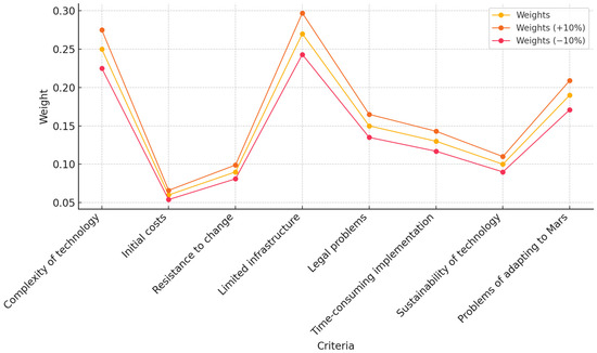 Weakness sensitivity analysis table and chart: The sensitivity analysis of the weaknesses in (Table 11, Figure 4) shows the effect of ±10% weight changes on the importance of each criterion. High-weight factors, such as “limited infrastructure” (0.27) and “technology complexity” (0.25), show high sensitivity, with adjusted weights ranging from 0.243 to 0.297 and 0.225–0.275, respectively, indicating substantial importance. Significantly weighted criteria, such as “Mars compatibility issues” (0.19) and “legal issues” (0.15), show significant sensitivity. In contrast, low-weight factors, such as “initial costs” (0.06) and “technology sustainability” (0.10), have little impact, indicating stability in the analysis. The figure illustrates these differences, with steeper slopes for high-weighted criteria and flatter curves for low-weighted criteria, supporting the prioritization of significant deficiencies and guiding strategic focus.