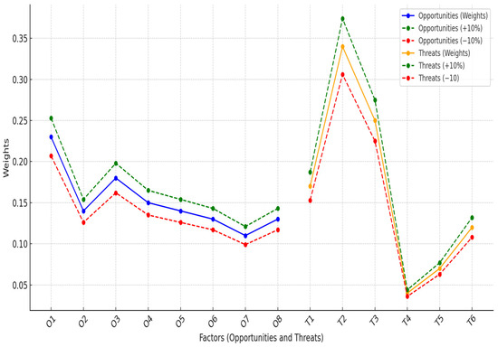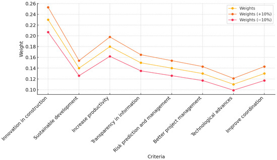 Opportunity point sensitivity analysis table: The sensitivity analysis of the opportunities (Table 14, Figure 5) shows how ±10% changes in the weights affect the importance of each criterion. High-weight factors such as “Innovation in Construction” (0.23) and “Increased Productivity” (0.18) show significant sensitivity, with adjusted weights ranging from 0.207 to 0.253 and 0.162–0.198, respectively, which emphasizes their critical role in exploiting the opportunities. Medium-weight criteria such as “Transparency in Information” (0.15) and “Anticipation and Risk Management” (0.14) show moderate sensitivity, while low-weight factors such as “Technological Advances” (0.11) show minimal impact with adjusted weights ranging from 0.099 to 0.121. This analysis confirms that the opportunities with higher weights are still the most influential.