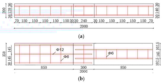 To investigate the effects of different vibration conditions on structural bending strength and failure modes, this study designed and produced UHPC-NC composite specimens with dimensions of 2000 mm × 350 mm × 200 mm. The joint size is 300 mm × 350 mm × 200 mm, with rebars arranged in an interlaced pattern in the joint. The spacing of rebars is 72.5 mm, and the cover thickness is 30 mm. The precast section size is 850 mm × 350 mm × 200 mm, the spacing of longitudinal rebars is 145 mm, and the spacing of transverse rebars is 150 mm. The configuration of the joint specimen is shown in Figure 1.