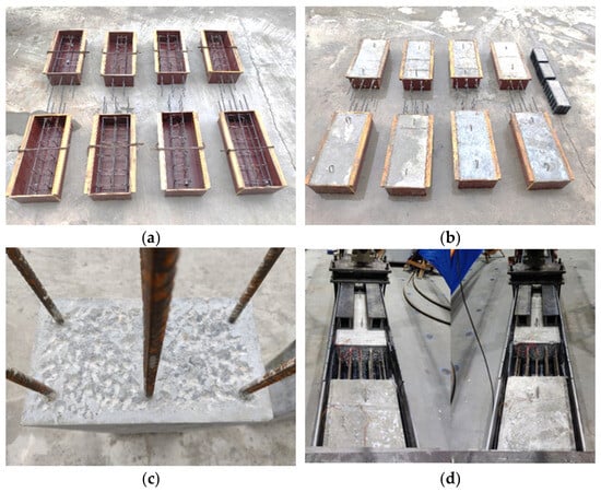 The specimen fabrication process is shown in Figure 2. First of all, according to the design size of the specimen and the layout of the reinforcement, the integral formwork was designed. Subsequently, the prefabricated parts were cast synchronously with ordinary concrete. Immediately after pouring, the specimens were covered with wet burlap and a plastic sheet. The specimens were then cured at room temperature for 28 days. After the curing process, the surface at the junction of the wet joint and the pre-cast section was made rough to improve the adhesion of the joint. Finally, the joint UHPC for the live-load vibration test was cast.