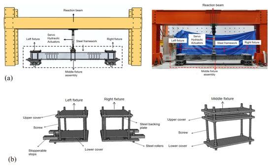 To simulate the live-load vibration to the fresh casting UHPC wet joints, a simulated vibration device was designed. In this study, a simulated vibration device was designed to simulate the live-load vibration of newly poured UHPC wet joints. The device in this study consists of three fixture components: left, middle, and right U-shaped steel formwork, precast RC blocks, and the actuator. The prefabricated RC blocks in the U-shaped steel formwork are clamped with left, right, and central clamp. The middle fixture is connected to the actuator that connected to the reaction beam, achieving simultaneous simulation of the deformation vibration of two joints []. The layout of the simulated vibrating device is illustrated in Figure 3a,b.