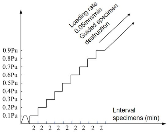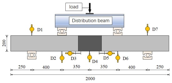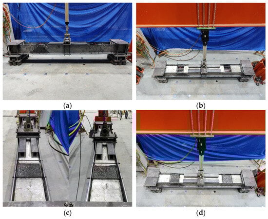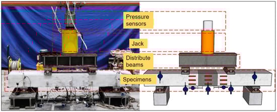 During formal loading, force control was initially used, with each increment of load staged at 10% of the ultimate load, maintained for a duration of 2 min to facilitate the observation of the material response and the emergence of test phenomena. Subsequently, the loading intensity was escalated to 90% of the estimated ultimate load at a rate of 3 mm/min. Thereafter, a displacement control protocol was implemented, with the loading rate modulated to 0.05 mm/min. When the load on the specimen could no longer be increased, the specimen was considered to have failed. The test set-up is shown in Figure 8.